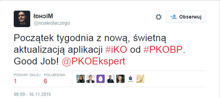 Klienci docenili zalety nowej wersji IKO, która została udostępniona 16 listopada br.: w niespełna 2 tygodnie osiągnęła aż 100 000 użytkowników. Dzięki nowym funkcjonalnościom uzyskali oni dostęp do pełnej bankowości za pośrednictwem telefonu. Klienci docenili przede wszystkim szybki proces aktywacji, który nie wymaga już kontaktu z pracownikiem call center, łatwą nawigację oraz przejrzysty interfejs.